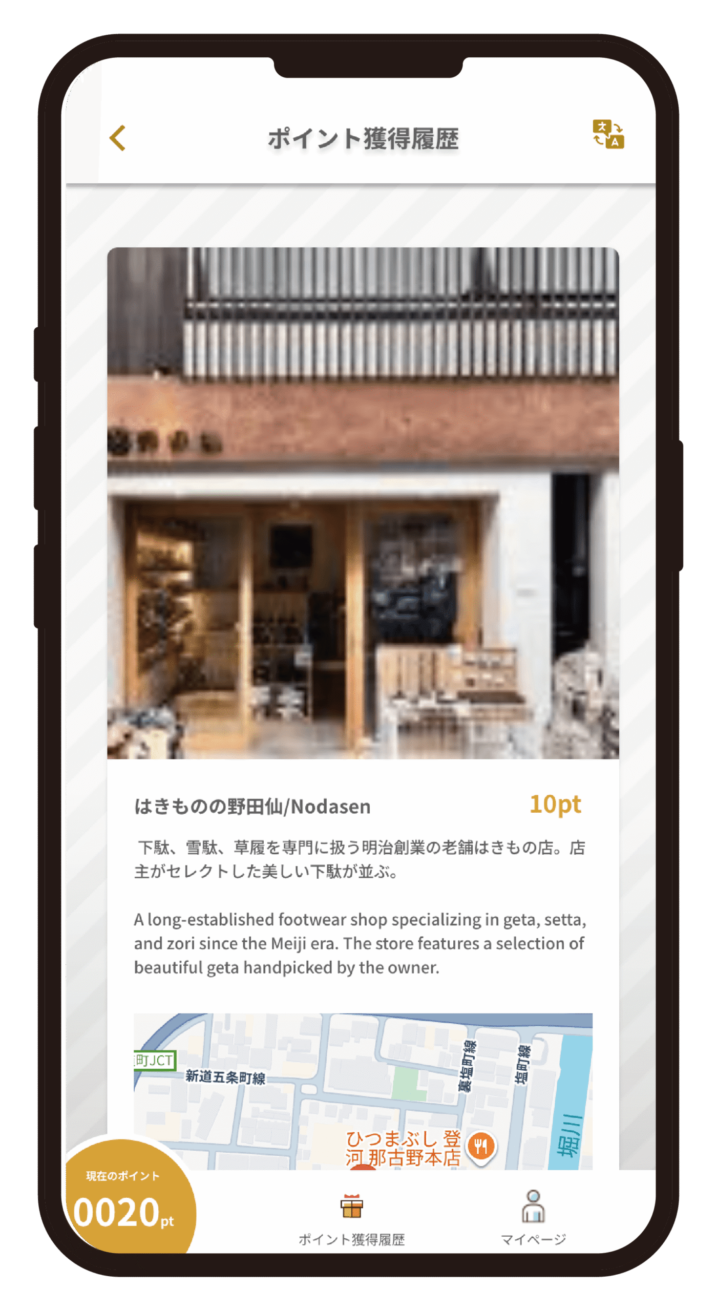 また、チェックポイントは五条橋、はきものの野田仙、なごのや、金刀比羅神社、長久山圓頓寺、きもの工藝ヲジマヤ、甘太郎、松露堂、駄菓子店たつやの9か所。商店街ならではの老舗や神社、寺、飲食店、菓子店などを巡る構成で、歩くこと自体が地域の魅力発見につながる内容となっていました。